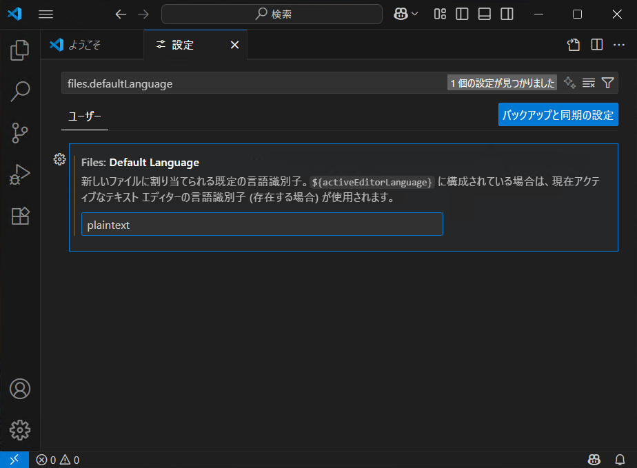 設定を開き(Ctrl + ,)、「files.defaultLanguage」を検索し、値に「plaintext」をセット