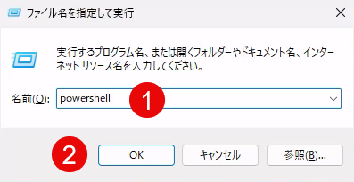 Win + R で「ファイル名を指定して実行」を開き、「PowerShell」と入力し OK