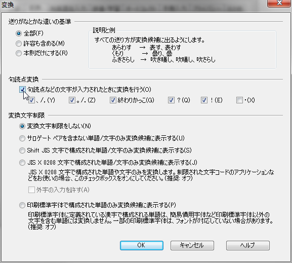 自動変換を快適にするには、句読点を変換トリガーに指定します。