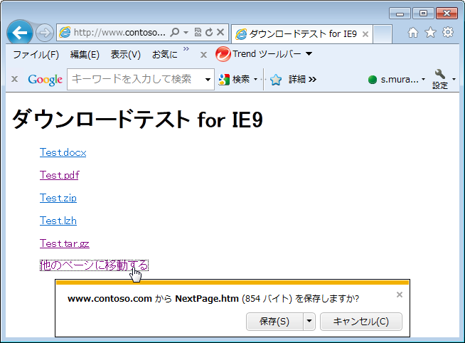 IIS の設定をしたら、IE9 のキャッシュをクリア(ページをリロード)して、ダウンロードの動作を確認します。