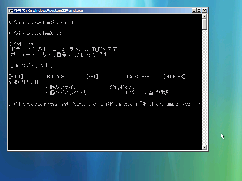 CDはDドライブに割当たっているので、Dドライブでimagexを使用してディスクイメージをキャプチャする