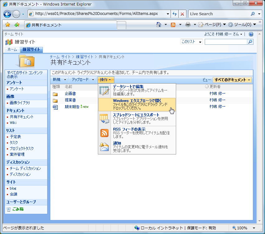 ファイルサーバライクに使うことが出来るのが「ドキュメント」だ。WSS上のファイルを直接更新することも出来るし、チェックアウトしてローカルディスクに持ってくることも可能だ。エクスプローラでWSSを開いて、直接ドラッグアンドドロップする事も出来る。