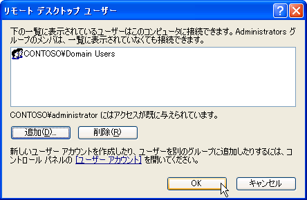 XPの準備が出来たら、リモートデスクトップでこのXPを使えるように設定します。リモート接続を許可は個別のアカウントではなくグループで与えると何かと都合が良いので、本稿では「Domain Users」を設定します。