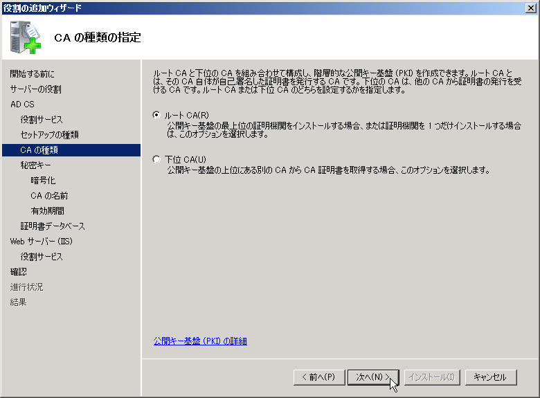 CS をインストールしていますが、別のサーバーや、AD CS 専用のサーバーを作って AD CS をインストールしても構いません。
