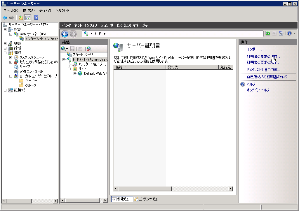 ほとんどの方には解説不要だと思いますが、Windows Server 2008 R2 への ftp の役割追加から解説しましょう。