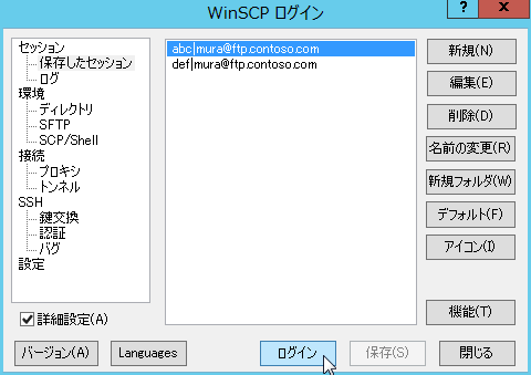 「セッション」では ftp.exe と同様に、ホスト名には物理 ftp Server の FQDN
