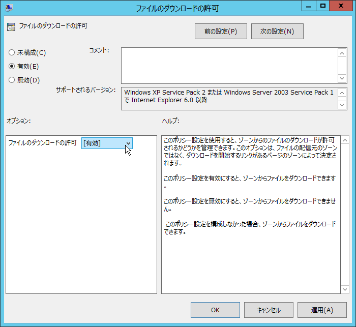 [コンピューターの構成]-[管理テンプレート]-[Windows コンポーネント]-[Internet Explorer]-[インターネット コントロールパネル]-[セキュリティ ページ]-[インターネット ゾーン]-[ファイルのダウンロードの許可]