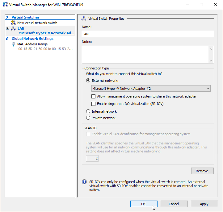 Nested Hyper-V VM が起動したら、VM の Hyper-V の役割を有効にし、割り当てた vSW を VM 側で vSW 設定すれば孫 VM 構築ができます。