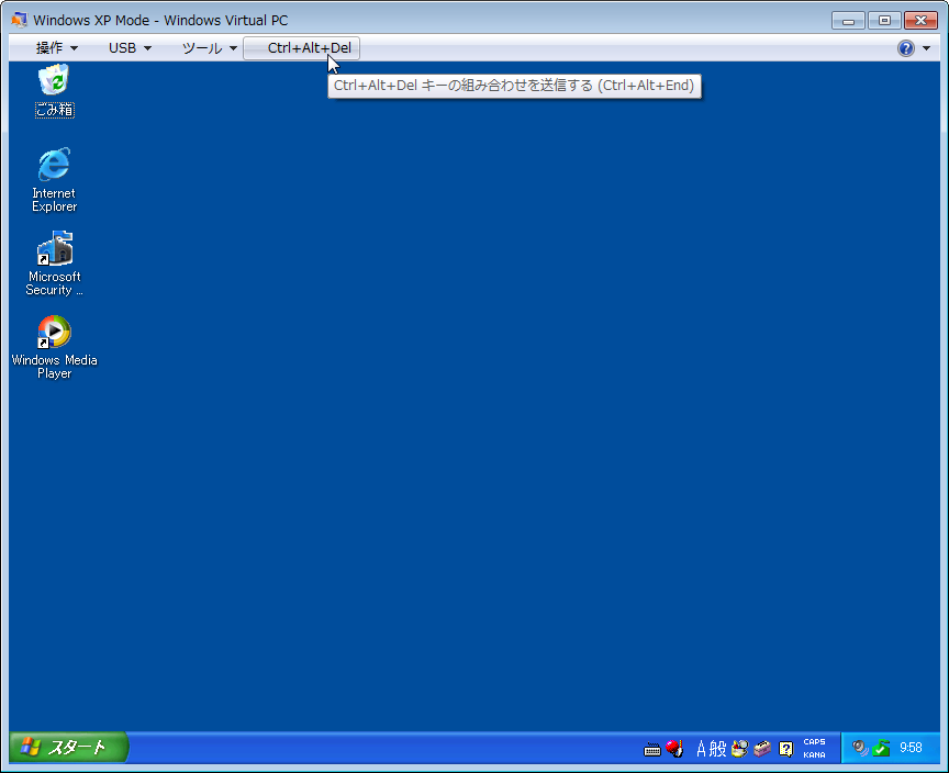 XP mode で使われている XP をシャットダウンしようとしても、「ログオフ」しかないのでシャットダウンすることができません。Virtual PC の設定を変更すれば「シャットダウン」も出せるのですが、お手軽にシャットダウンするには、メニューから「Ctrl+Alt+Del」を送信してシャットダウンできます。