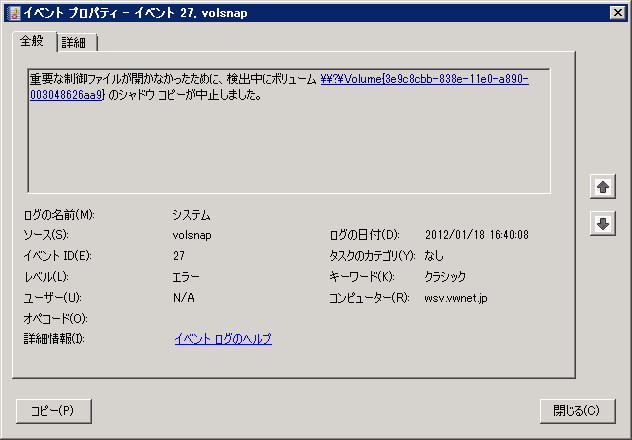 エラーメッセージに「イベントの詳細で解決策を確認し」とあるので、関連のありそうな volsnap 27 を確認してみます。